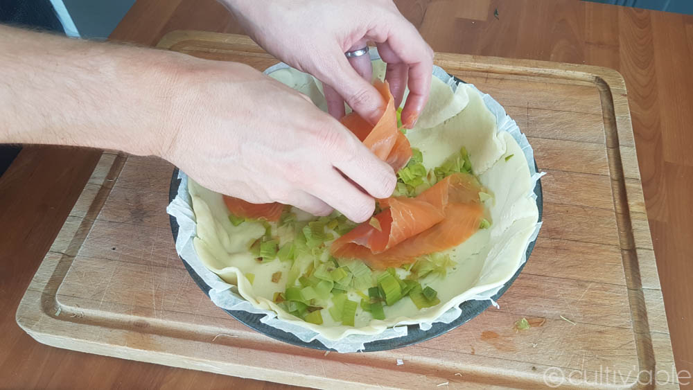 4. Répartissez 1/3 des poireaux au fond du plat puis disposer le saumon.