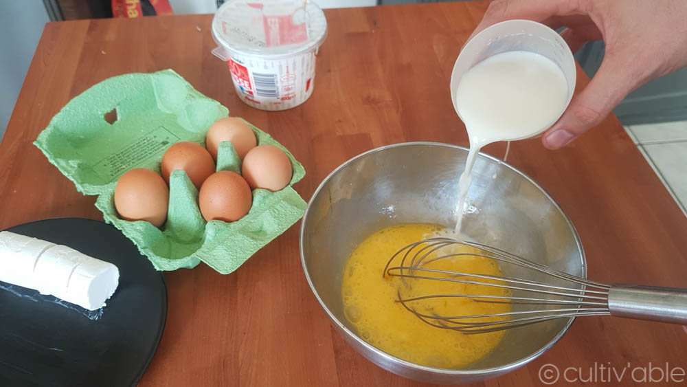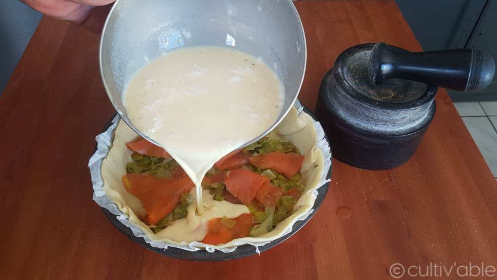 5. Dans un saladier : battre les œufs, ajouter le lait, la crème et les épices. Répartissez le mélange délicatement sur la pâte.